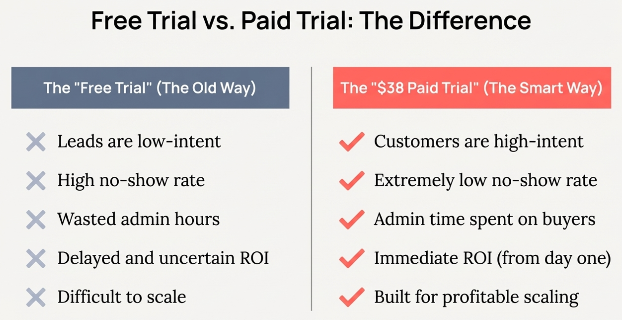Immediate Ad Spend Liquidation: The revenue from the trial covers the cost of the ads immediately, allowing us to scale the budget without fear.